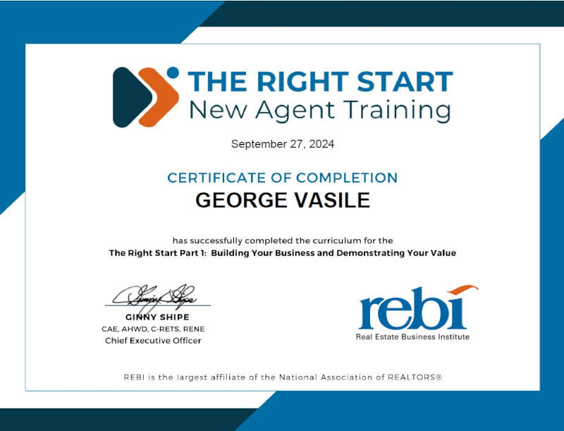 Certificările obținute de George Vasile sunt emise de REBI – Real Estate Business Institute din Statele Unite, instituție specializată în educația avansată a profesioniștilor din domeniul imobiliar. REBI este afiliată la NAR – National Association of REALTORS®, cea mai mare organizație profesională a agenților imobiliari din lume, cu peste 1,5 milioane de membri.
